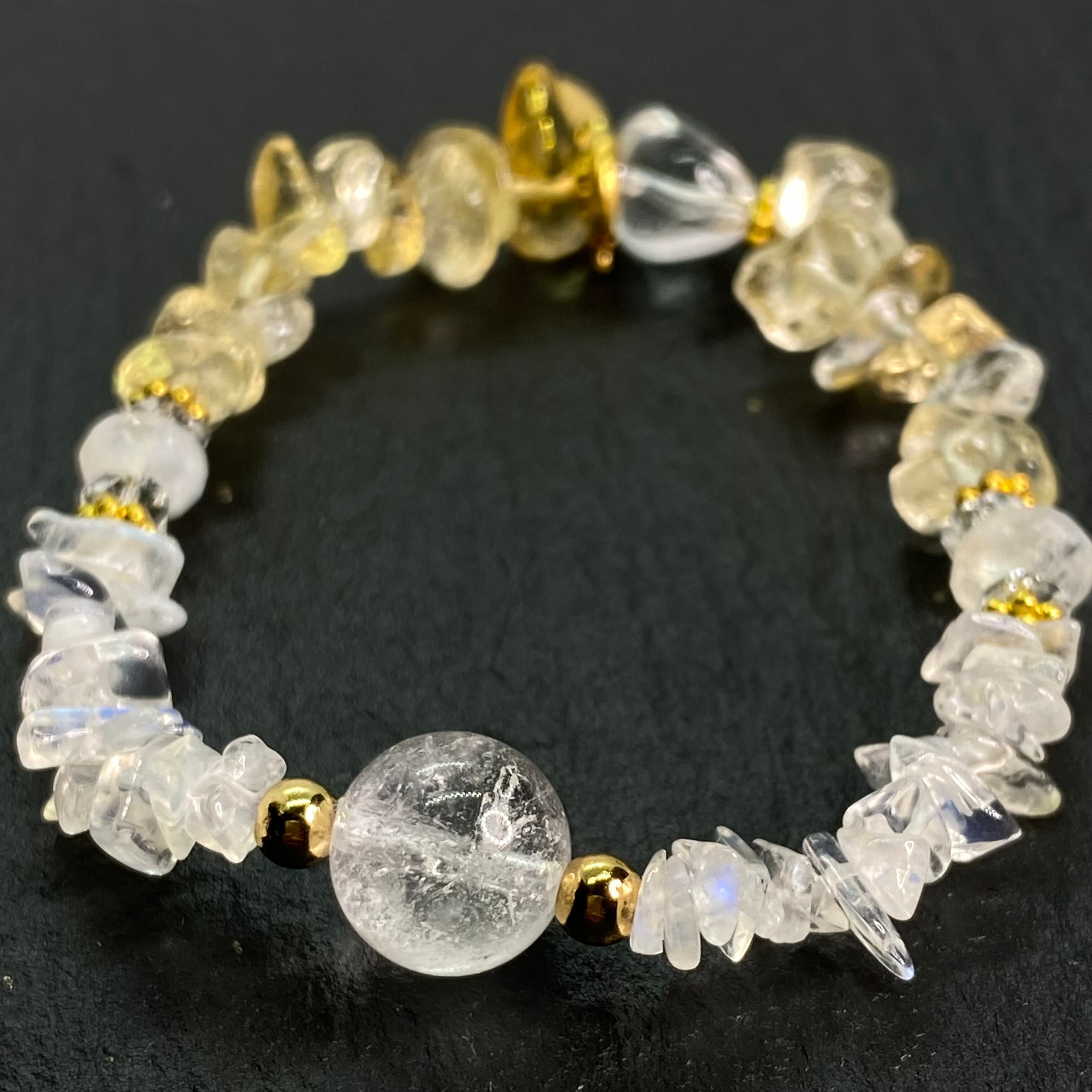 マニカラン水晶をポイントにシトリンとレインボームーンストーン、タンブル水晶を使用したエレガントで繊細なシャンパンカラーブレスレットを作りました。