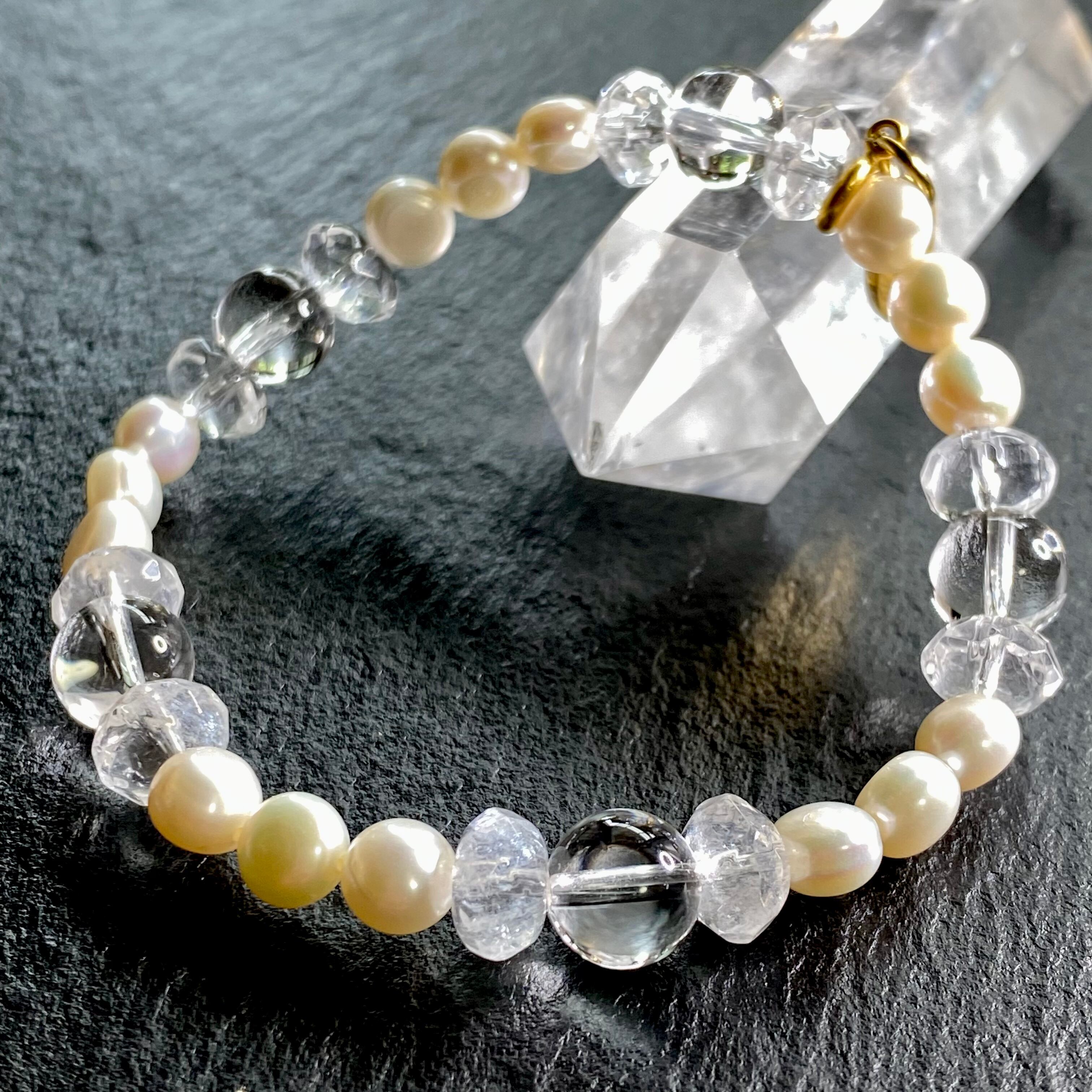 おまんじゅう型の淡水パールと水晶のみで作ったシンプルなブレスレットです。