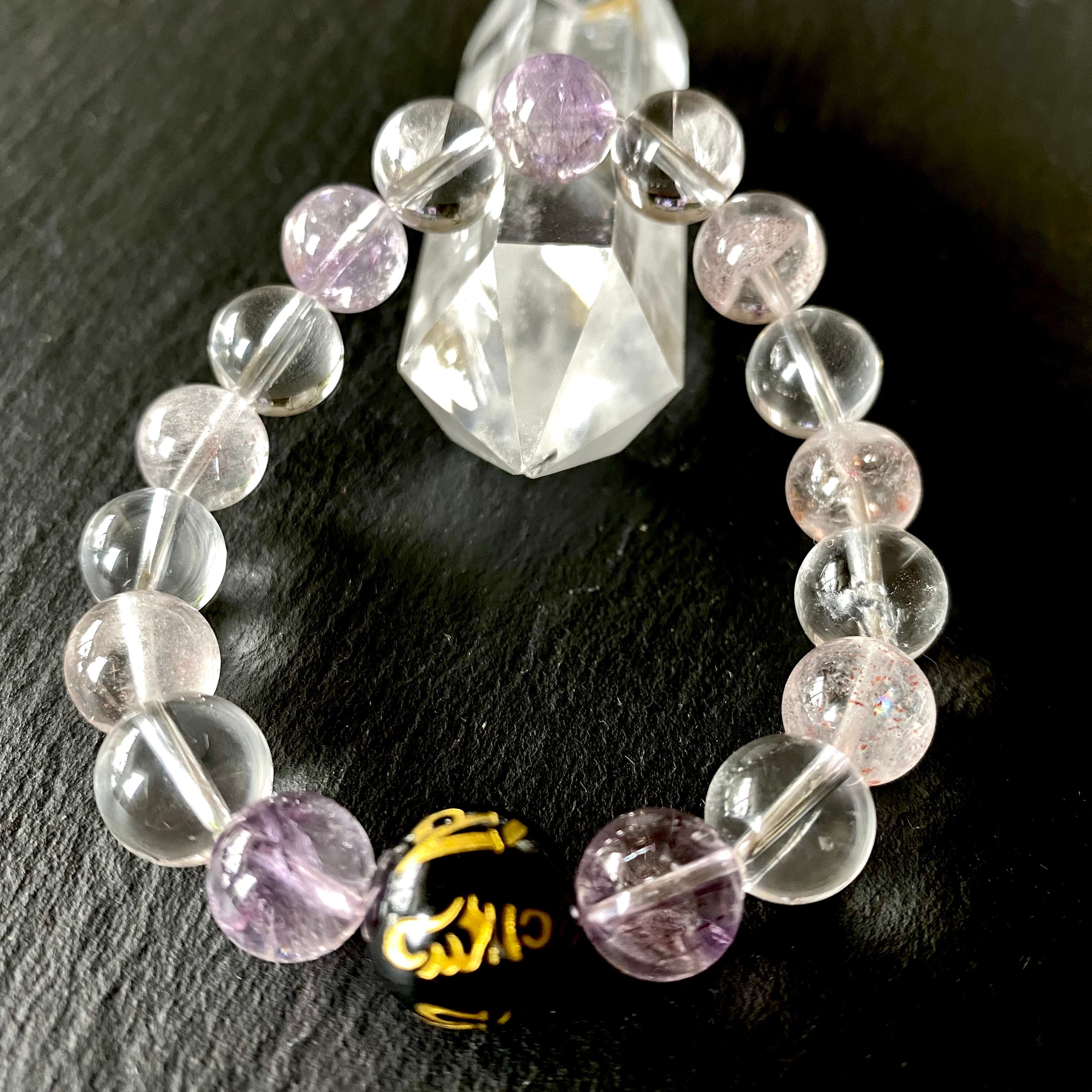 オニキスに手彫りされた梵字をポイントに、スーパーセブンと最高品質水晶で仕上げました。