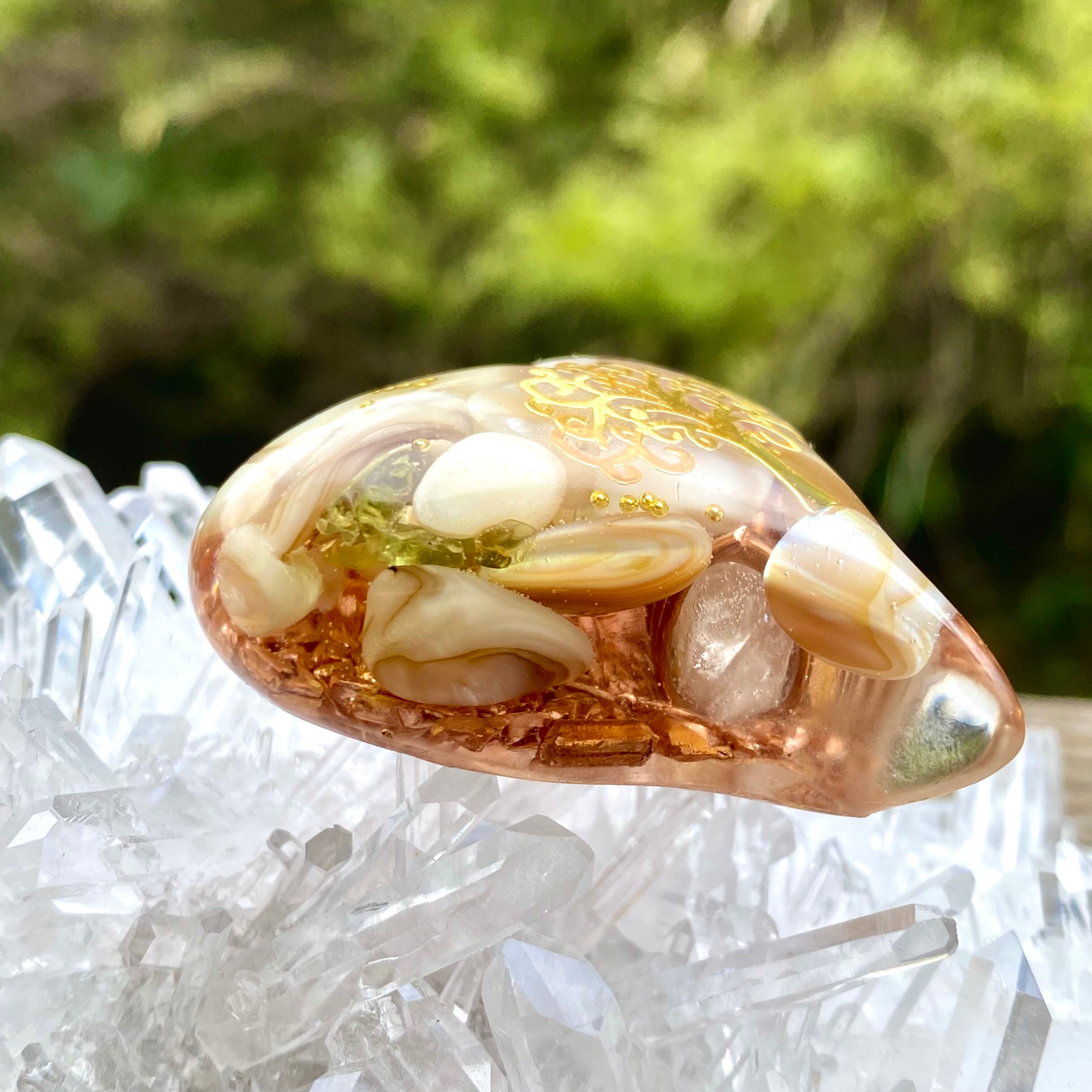 手に握れるサイズで、心を落ち着かせる効果が期待できます。光波動天然石がたっぷりと入っているので、宇宙と地球のエネルギーを感じられます。