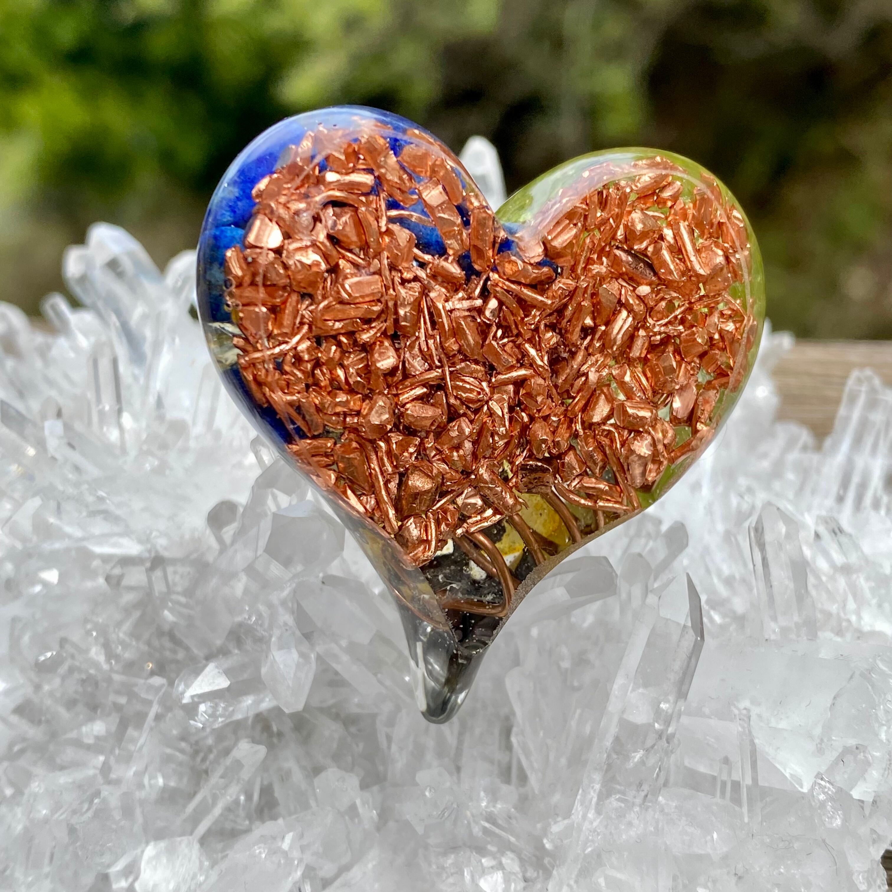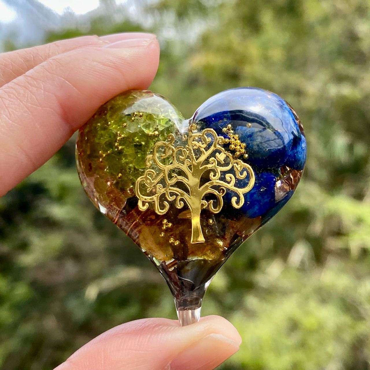 ハート型のオルゴナイトは、愛や癒しのエネルギーを強め、自己愛を高める効果も期待されています。