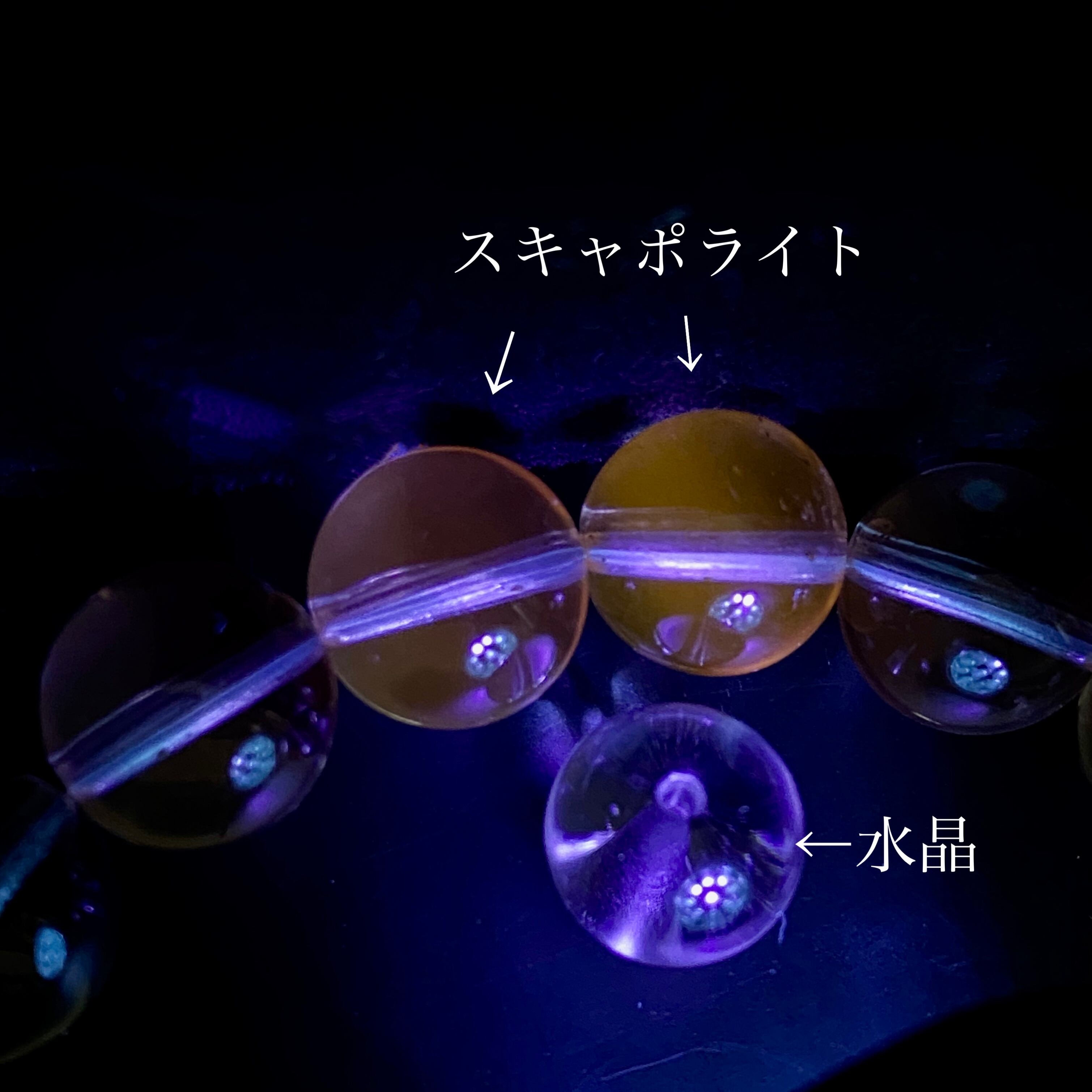 写真5枚目。水晶と並べて紫外線ライトを当てて撮影。