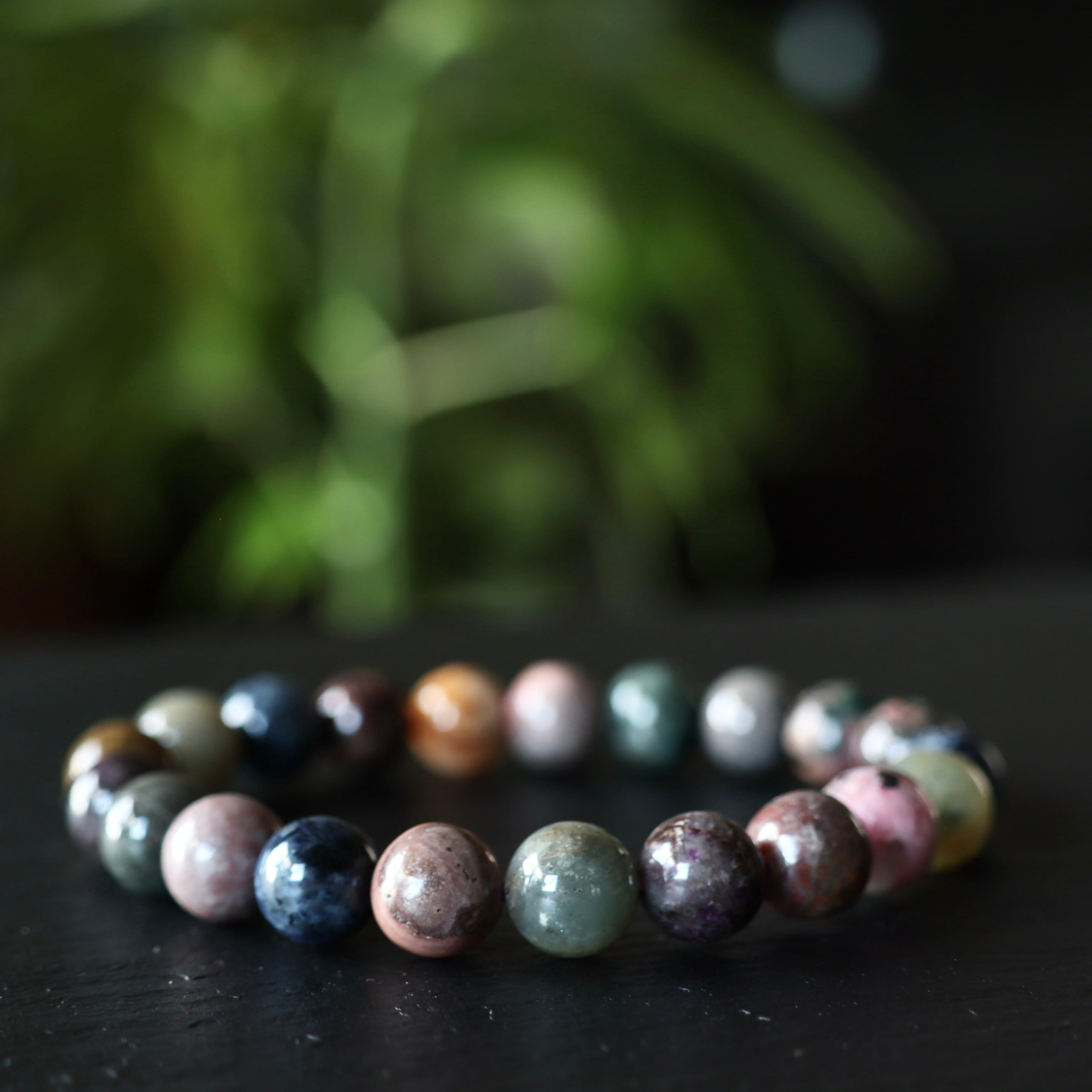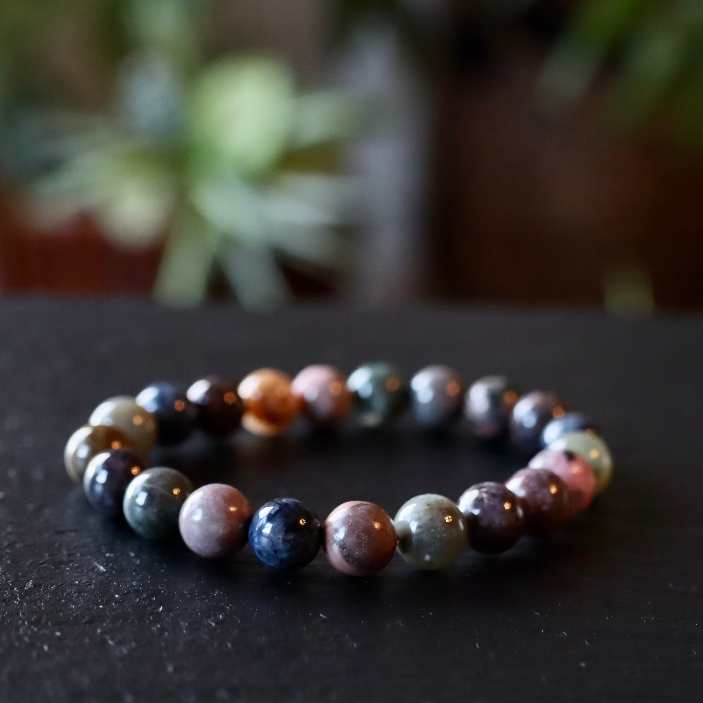 その魅力を最大限に引き出すため、多彩な色彩を持つスギライトを集めブレスレットを組みました。