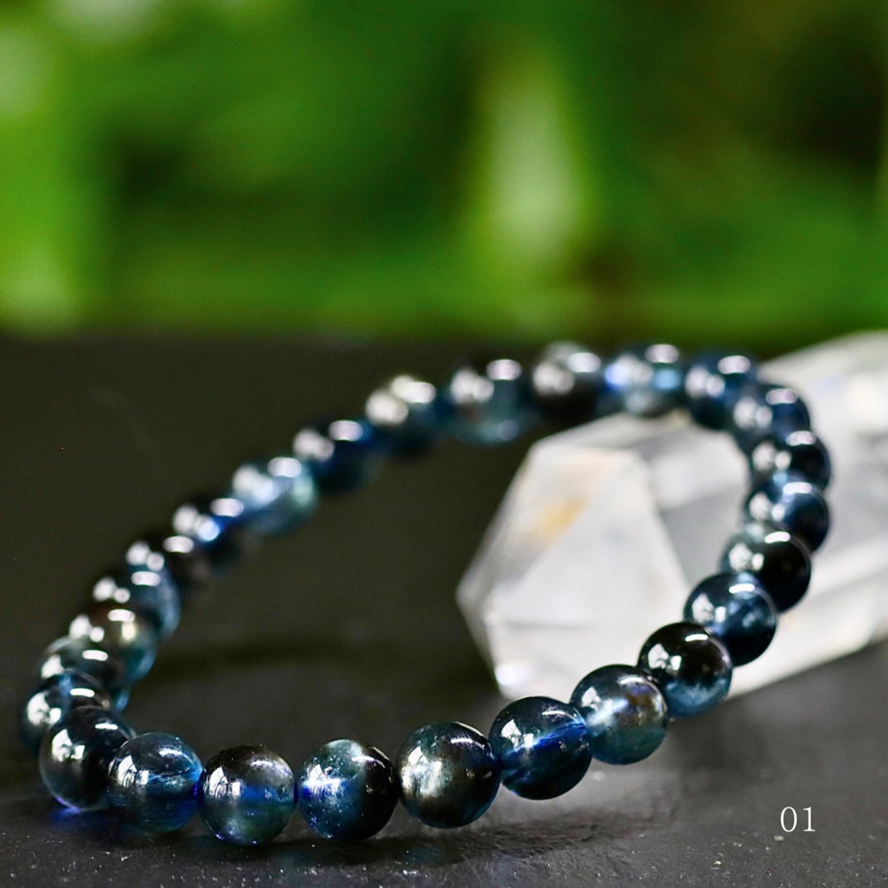 美しいシルバーブルーのシラーが全玉に輝く、希少なモスアクアマリンのブレスレットです。