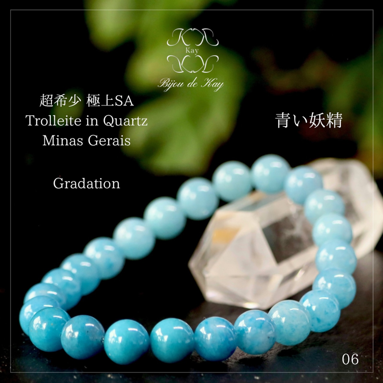 青い妖精 超希少 極上 SA トロレアイトインクォーツ グラデーション 約8.5㎜ 光波動 ブレスレット B0524-06 トロレアイト