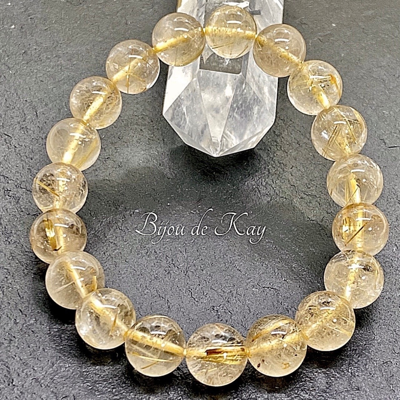 内部に金色の針状の結晶が美しく輝く、まさに自然の芸術品です。光を受けるたびにゴールドの輝きが反射し、手元を華やかに演出します。個々の結晶が異なるため、どのブレスレットも世界に一つだけです。