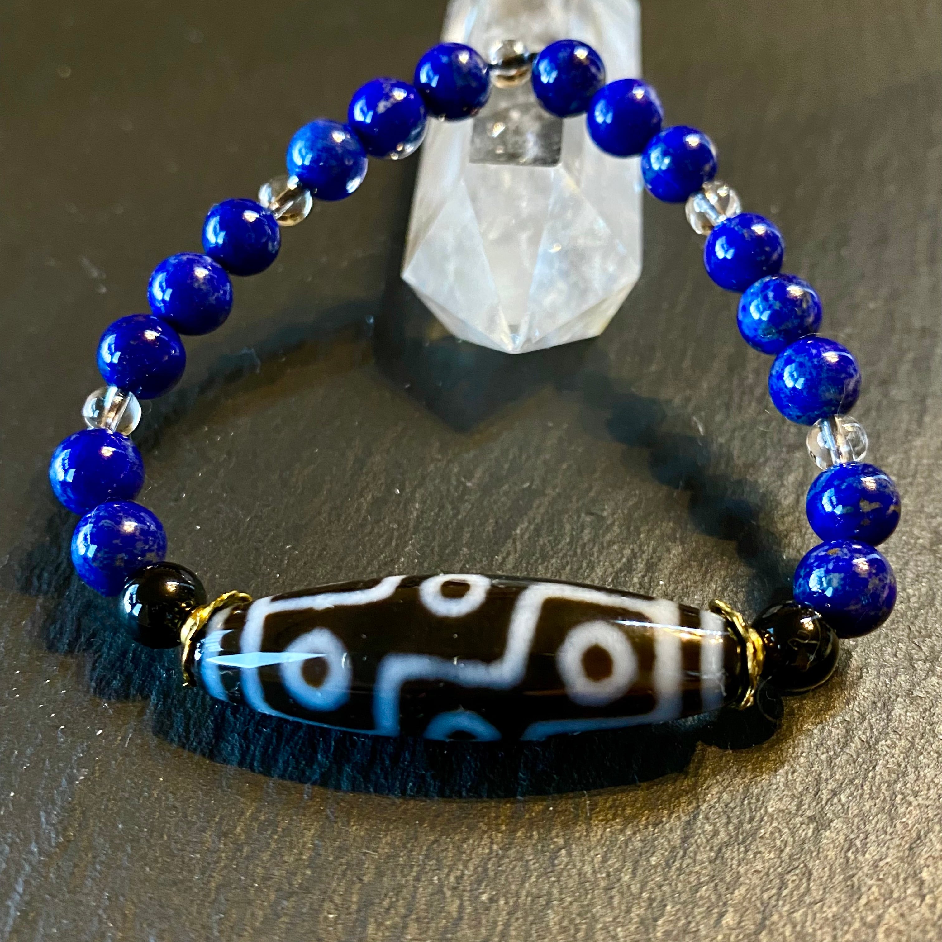 九眼天珠、ラピスラズリ、水晶、モリオンが織りなすエネルギーのハーモニーが、あなたの心と魂を深く癒し、守ってくれるでしょう。