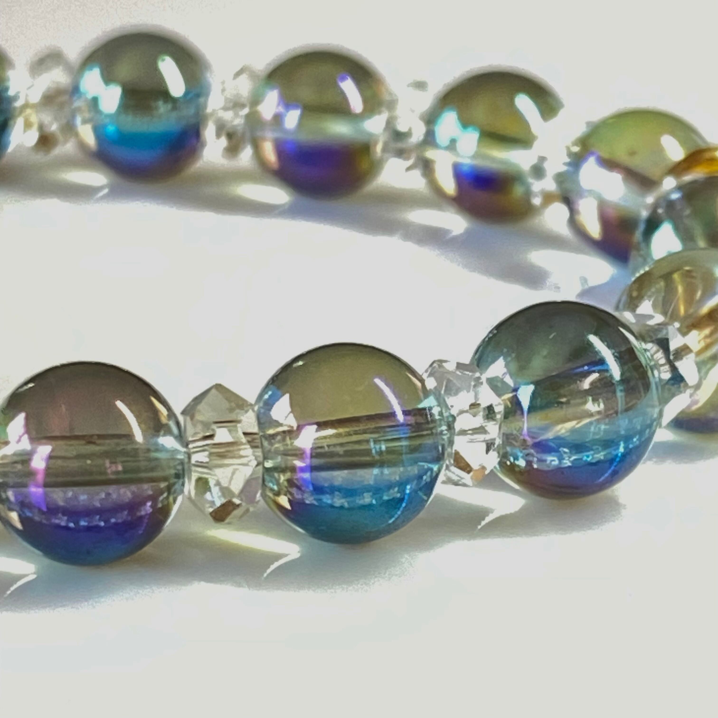水晶の表面に1,600℃の高熱でイオン化したチタンや金属を真空蒸着させたもの。